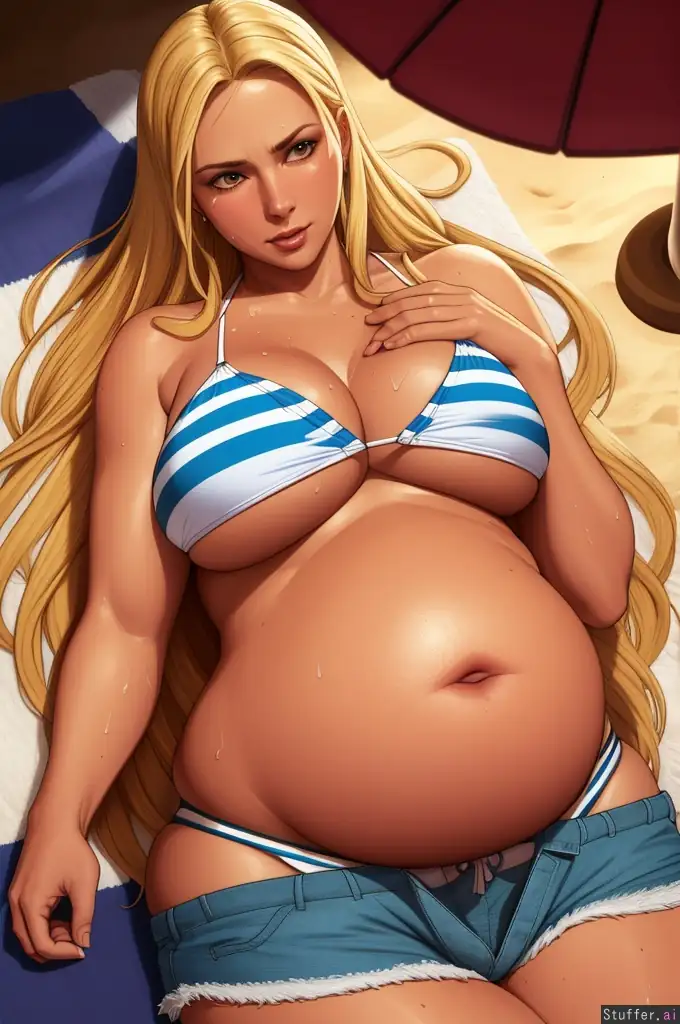 (Photo realistic, highly detailed, chiaroscuro), from above, beach, gorgeous woman lying on towel, stroking her belly; sweaty skin, very long blond hair, small breasts, (stuffed round belly, slightly bloated), deep navel, hands on belly; striped bikini top; too tight jean shorts; overfed, huge belly