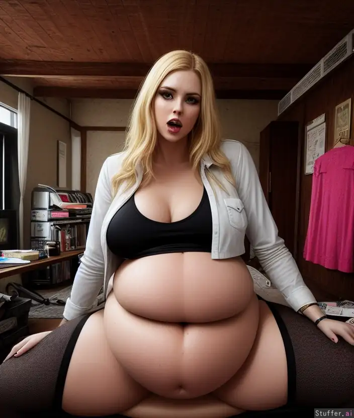Erin moriarty, blonde bimbo, partys too much, buttoned crop top revealing (chub, vore belly), skin-tight (distressed fashionable sexy pants, (detailed environment)