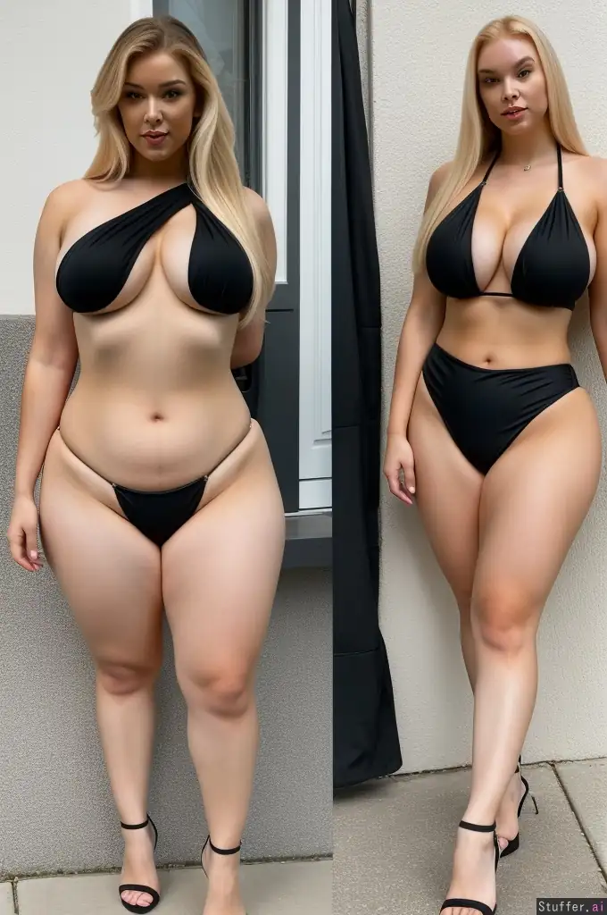 before and after (bimbofication:1.4, 2 images of same girl, from skinny to curvy, weight gain:1.2, from small breasts to huge breasts, before has small breasts, progress pics), young woman, gorgeous face (realistic detail, large round eyes, mercy overwatch:0.8), blonde hair, 4k, raw photo, full body shot, facing camera, in focus, front lighting, large fat ass, wearing black bikini
