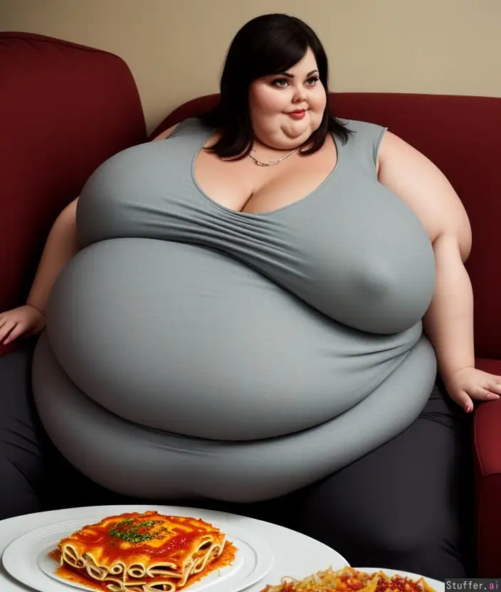 photo of one twenty year old immobile cute short plump round young southern college girlfriend, ultra detailed hd, side view, obese, belly is like a gigantic ball plumpky filled with fat, theme is gluttony, stunningly beautiful face, ultra-detailed face, sitting on a couch, at a table with a gigantic baking pan of lasagna on it, overeat, messy, too much food, gigantic spherical gut swelling against the table, (comfy dress pants, comfy dress shirt, fully clothed:1.3), (((huge breasts))), big fat shelf booty, soft smooth flowing fancy updo hair , light makeup, plump fat face, short fat legs, background is a big upper class livingroom soft couch, shot on Fujifilm Superia 400, ultra detailed fabrics and clothing, ultra detailed background, highly detailed food, soft diffused window light, 32k, cinematic composition, professional color grading, indoor lighting,