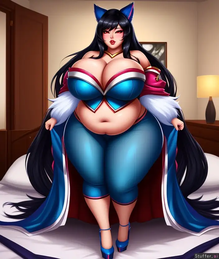Ahri from league of legends, insanely obese, very wide body, very busty body, light makeup, plump round face, black hair, very huge belly, wide hips, tall, wearing Ahri's clothes, plump lips, full body view, in bedroom