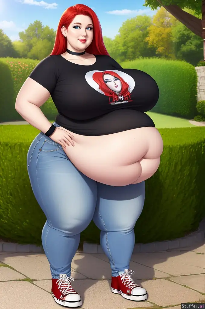 high resolution, detailed face, photorealistic, masterpiece, (full body), garden, (solo), standing, woman, light-blue eyes, long red hair, lips, pale skin, kind smile, choker, wristband, t-shirt, jeans, chucks, fat, obese, morbidly obese, huge belly, round belly, gigantic belly, stuffed belly, belly hang, huge breasts, ssbbw, wide hips