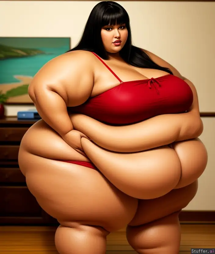 Sexy morbidly obese chel ssbbw, photorealistic, (bottom heavy pear), (Massive fat blubber legs), lower body wider than upper body, stuffed gut with two rolls, massive wide hips, symmetrical, gorgeous face, morbidly obese calves, narrow shoulders, front view, round navel