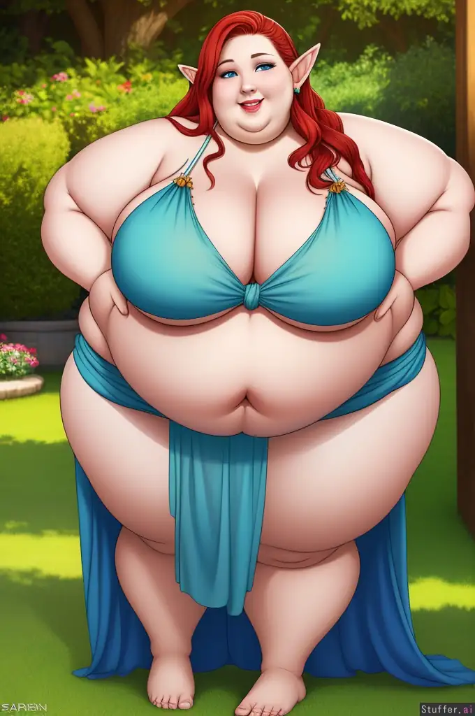 high resolution, detailed face, photorealistic, masterpiece, (full body), garden, standing, (solo), elf woman, light-blue eyes, long wavy red hair, lips, pale skin, kind smile, halter top, sarong, barefoot, midriff, cleavage, (fat), (corpulent), morbidly obese, (gigantic belly), huge belly, stuffed belly, round belly, big belly, belly hang, ssbbw,