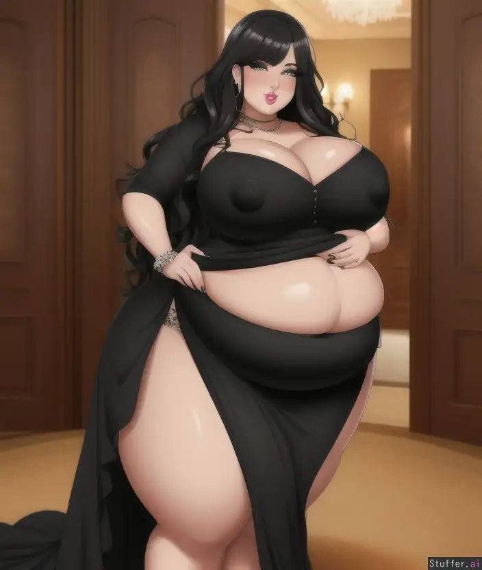 masterpice, ssbbw, obese gyaru goth mommy, beautiful detailed face, beautiful detailed eyes, light makeup, black wavy hair, fat very round face, double chin, plump lips, very wide hips, huge belly, very busty body, bimbo mommy, wearing black dress, in mansion, full body view, tall, dominant, seductive look, insanely obese body, nipples poking throught dress, huge fupa under belly