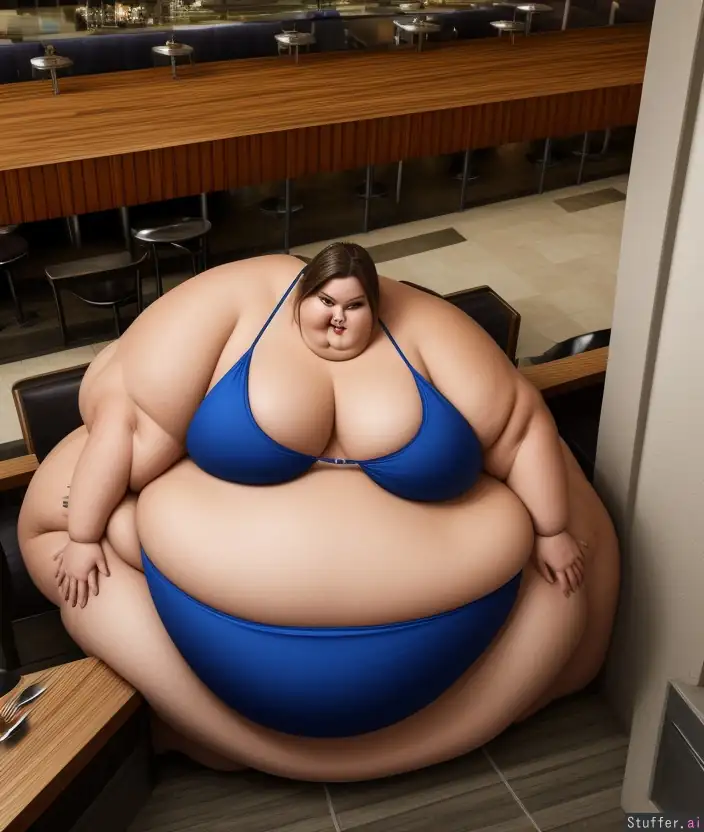 ((Ssbbw is a mini giantess beached whale)) ((trying to squeeze through the beach's restaurant doorway but she's too big while leaving )) (heavy stomps )(button bikini ) (full body photography) (panoramic view)