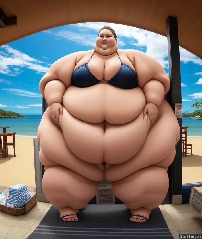 ((Ssbbw is a mini giantess beached whale)) ((trying to squeeze through the beach's restaurant doorway but she's too big while leaving )) (heavy stomps )(button bikini ) (full body photography) (panoramic view)