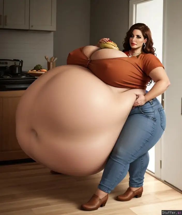Feminine milf, long wavy brown hair, proudly showing belly, fully clothed in jeans and ((belle poque women's solid short sleeved buttoned up shirt)), necklace, kitchen with food, (slender hips), (gigantic boobs:1.4), (big hyper belly:1.6),