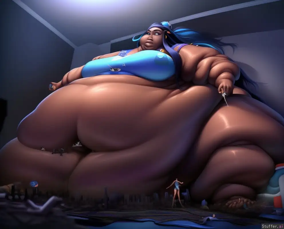 best quality, high rating, (solo), (detailed), (realistic anime), nessa_(pokemon), long hair, dark skin, massive belly, croptop, very fat,ripped sweatpants, bedroom, ssbbw, (snatched chubby waist), (big breasts:1.5), (large thighs:1.3), ((((((Giantess)))))), (((((eating city))))), (((((ussbbw))))), (((blob)))
