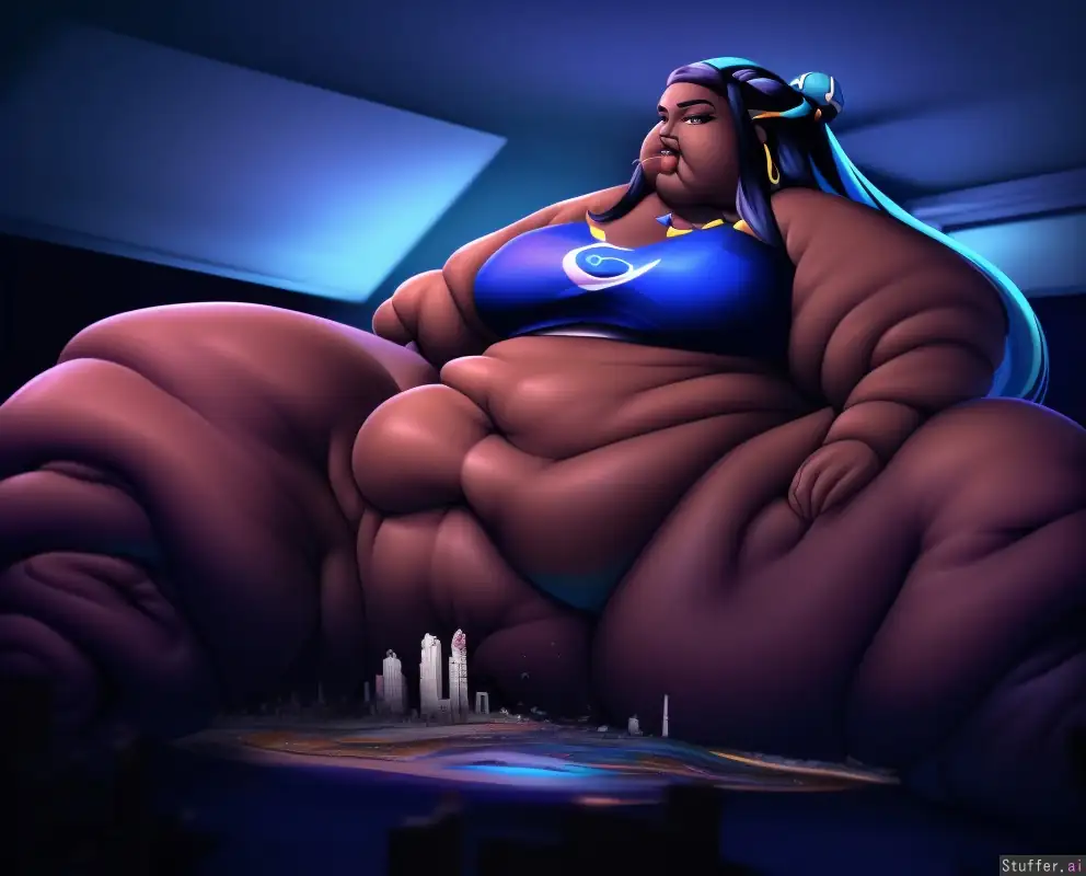 best quality, high rating, (solo), (detailed), (realistic anime), nessa_(pokemon), long hair, dark skin, massive belly, croptop, very fat,ripped sweatpants, bedroom, ssbbw, (snatched chubby waist), (big breasts:1.5), (large thighs:1.3), ((((((Giantess)))))), (((((eating city))))), (((((ussbbw))))), ((((blob))))