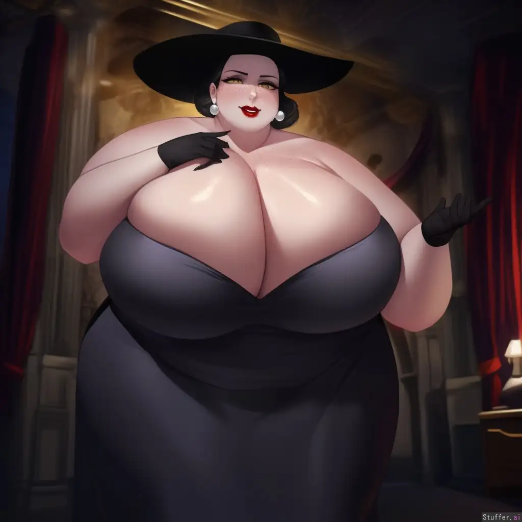 best quality, high rating, very pale skin, (yandere smile:1.2), (looking at viewer:1.2), better face, super soft very pale skin, (art by mmmmmkun), (art by bamboo-ale:1.4), fulll body shot, (freckles:1.2), (fully clothed:1.4), (Solo:2), (1girl:2), (alcina dimitrescu), (black gloves, black hair, black hat, dress, earrings, gloves, hat, jewelry, long dress, long sleeves, looking at viewer, pearl earrings, red lips, short hair, sun hat, white dress, yellow eyes,:1.2) (strong buff arms:1.2), (huge breasts), wide fat hips, massive hyper thigh, ssbbw, curvy woman, fully clothed, looking at viewer, (low angle:0.7), wide hips, (thick thighs:1.2), (deep cleavage), (morbidly obese:1.4), (ussbbw:1.8), (tall woman:1.6), cleavage, buff strong legs, large thick legs, (detailed spooky mansion interior background:1.8), perfect ambient lighting, (ultra detailed realistic anime style), insanely detailed, masterpiece, hyper resolution, beautiful,