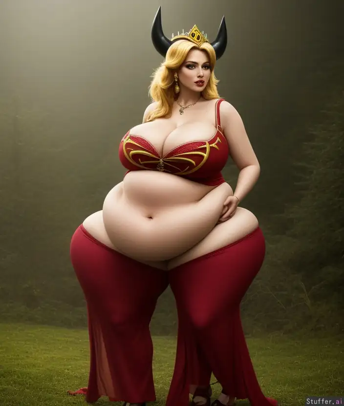 8k, photorealistic, extremely detailed, soft lighting, rim lighting, bokeh, (Princess Peach), ((((massive hips, enormous thighs, round belly, cleavage)))), cellulite, Hogwarts, Gryffindor, (((demonic:1.3))), ((satanic:1.2)), ((devil)), cow_ears