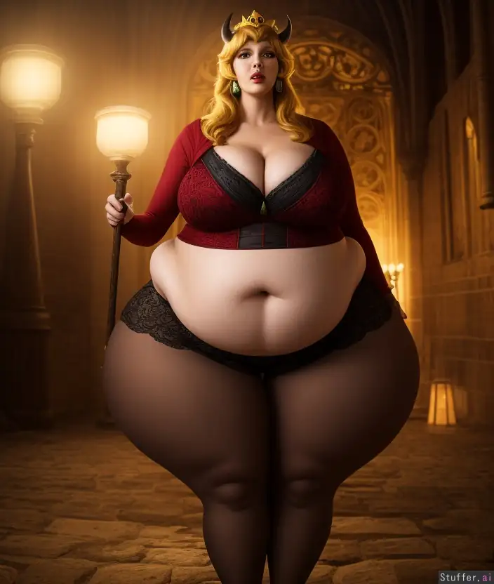 8k, photorealistic, extremely detailed, soft lighting, rim lighting, bokeh, (Princess Peach), ((((massive hips, enormous thighs, round belly, cleavage)))), cellulite, Hogwarts, Gryffindor, (((demonic:1.3))), ((satanic:1.2)), ((devil)), cow_ears