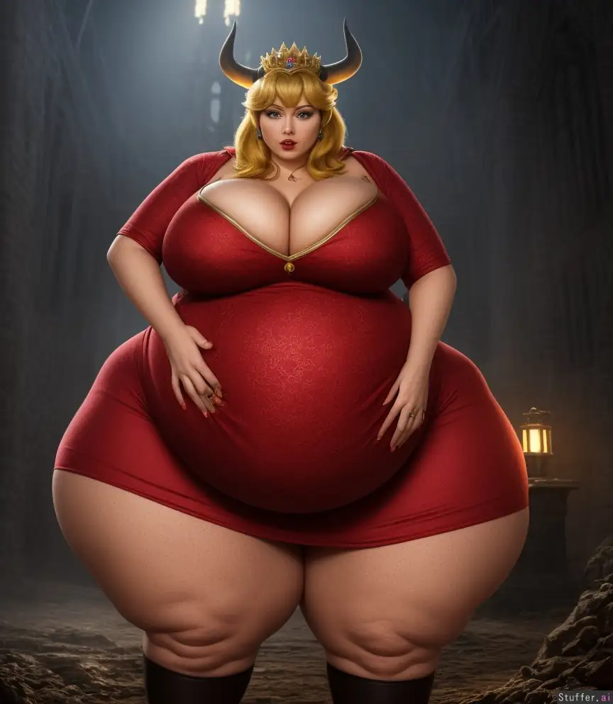 8k, photorealistic, extremely detailed, soft lighting, rim lighting, bokeh, (Princess Peach), ((((massive hips, enormous thighs, round belly, cleavage)))), cellulite, Hogwarts, Gryffindor, (((demonic:1.3))), ((satanic:1.2)), ((devil)), cow_ears