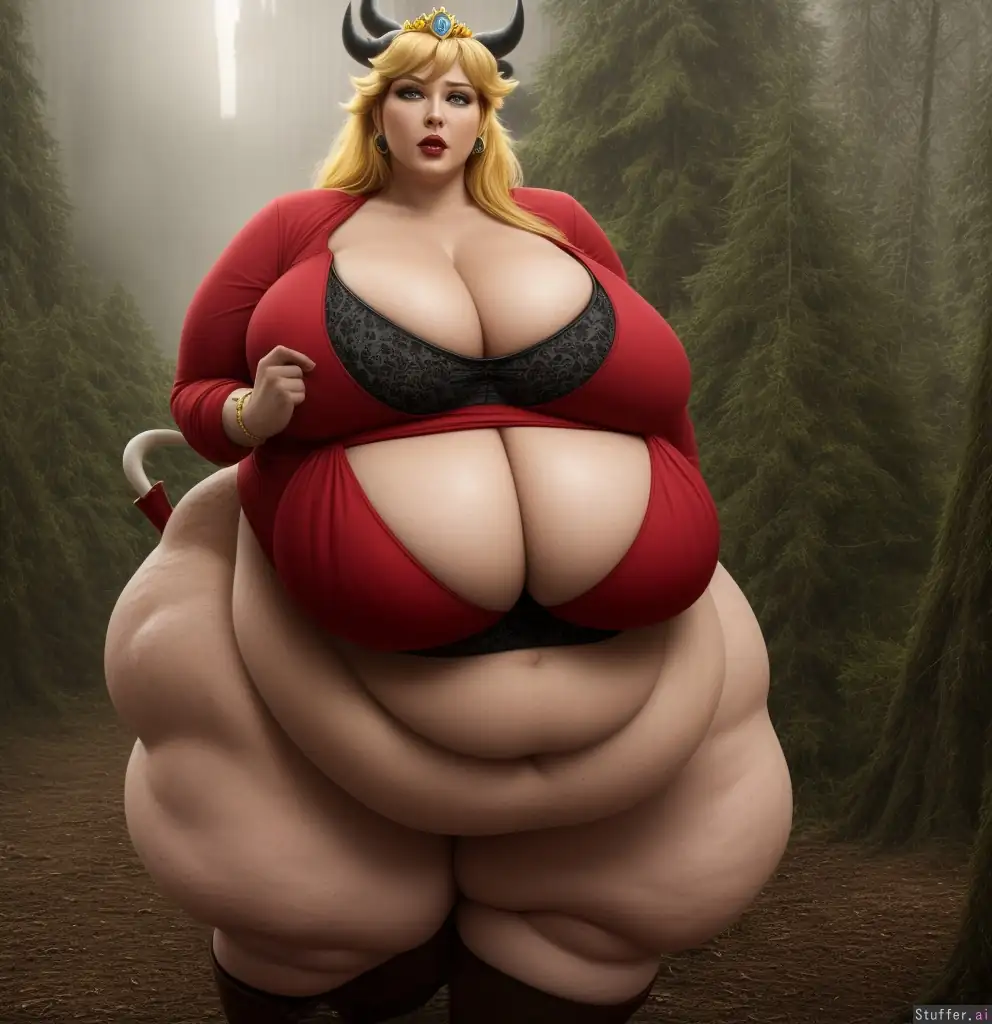 8k, photorealistic, extremely detailed, soft lighting, rim lighting, bokeh, (Princess Peach), ((((massive hips, enormous thighs, round belly, cleavage)))), cellulite, Hogwarts, Gryffindor, (((demonic:1.3))), ((satanic:1.2)), ((devil)), cow_ears