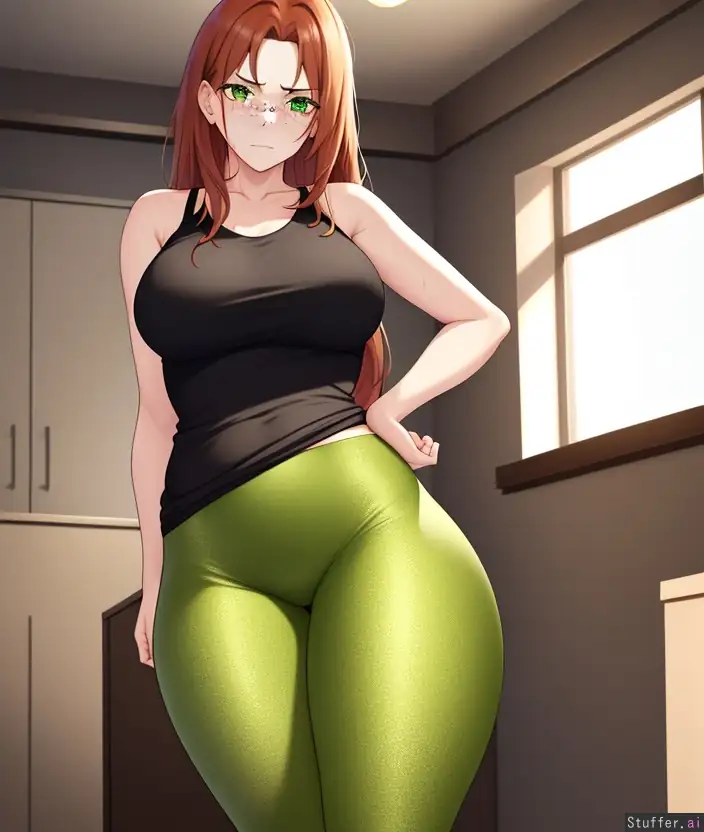 Best quality, high resolution, 4k. 1girl, solo, mid-20s, straight auburn hair, freckles, skinny and fit. Wearing a black tank top and green leggings. Natural curves highlighted, but there's a hint of dissatisfaction in her expression. Soft, warm lighting with a slight focus on her facial features. Standing in a casual pose, facing the viewer, slightly introspective, in a cozy, lived-in room setting.