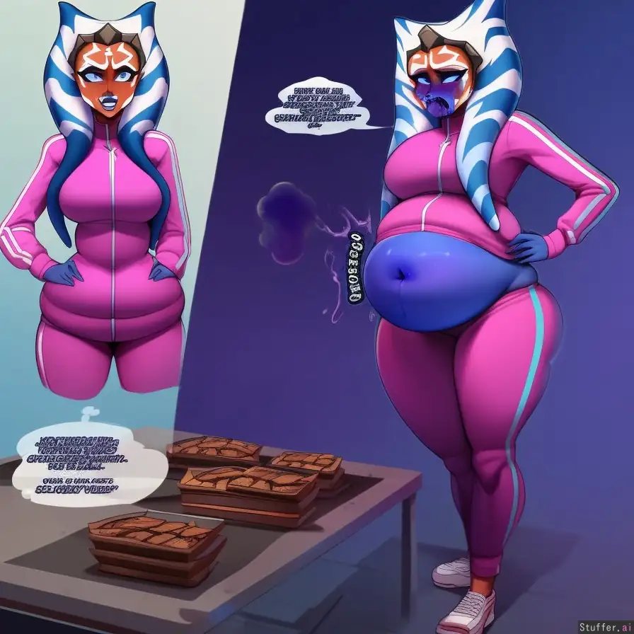 best quality, high rating, ahsoka, light pink tracksuit, deep blue skin, heavy eyeliner, round tight belly, blueberry inflation, burping bloated, hands on hips, gurgling belly. Eating a table full of blueberry pies, before and after(thick thighs)