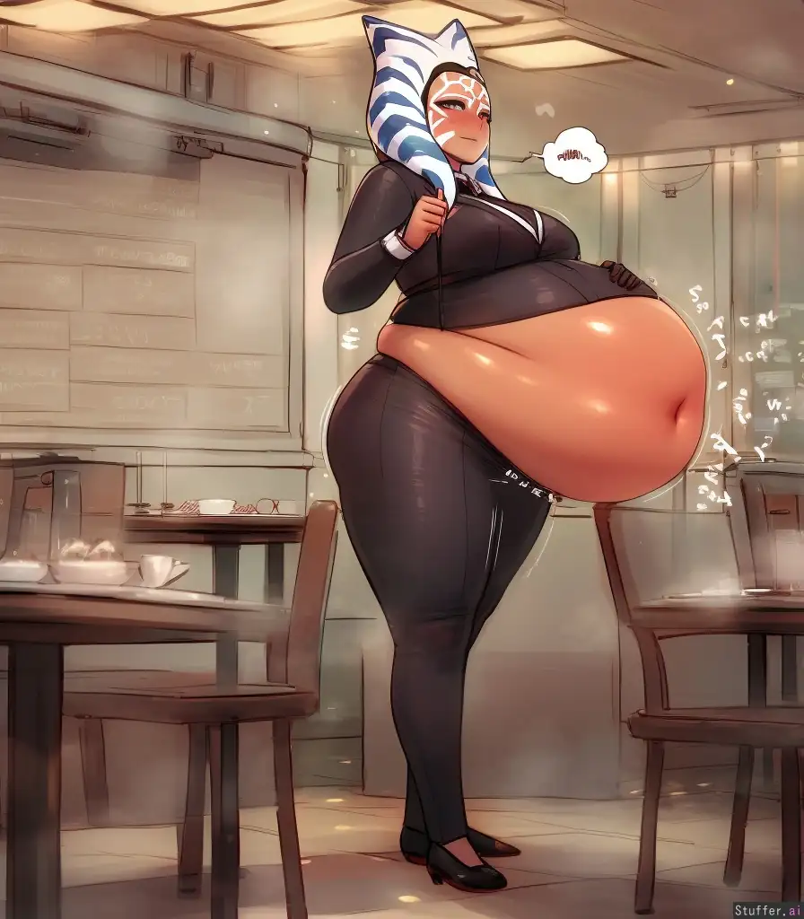 best quality, 4k, high resolution, highres, very detailed, solo, Waitress, Ahsoka, (betterwithsalt(artist)), c.cu(artist), (at diner), formal clothes, cute stuffed belly, chubby, sigh, fatten_breasts, wide_hips, big_butt, deep navel, (chubby belly), soft round belly, smooth belly, full belly,((some dinners on table), eating some dinners, ((lots of expansion_lines around belly)), (((more expansion_lines around belly))), ((regular customer hands fed and grab waitress's belly:1.3))