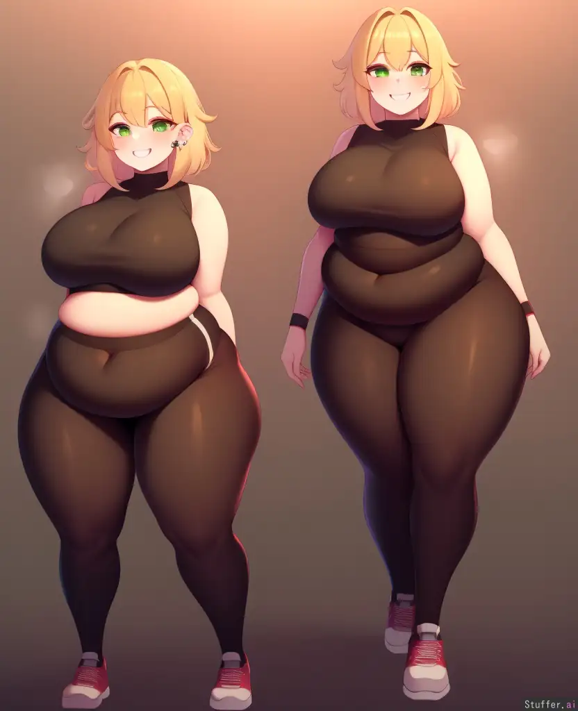 best quality, high rating, high_resolution, perfect_anatomy, full_body, facing_viewer, anime, ssbbw, 1girl, chubby_face, round_face, green_eyes, small_breasts, huge_belly, round_belly, wide_hips, thick_thighs, messy_hair, blonde_hair, short_hair, ear_piercings,solo, extra cute face, sensual and satisfied expression, embrassed smile, tight sport clothes, sensual pose froma the back, leggings, sitting pose, hot and steam.