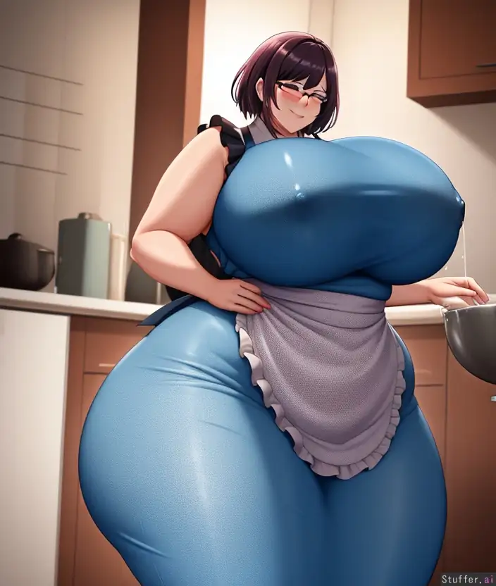 looking_down, chubby, hourglass, huge_breasts, mature woman, short_hair, apron, tight shirt, smug, huge_ass, lactation