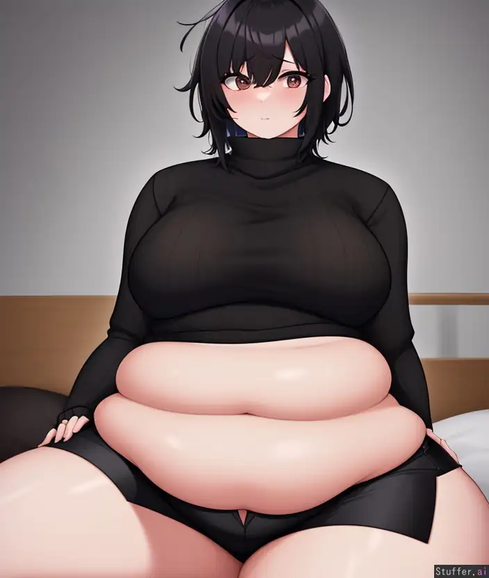 1girl, high quality, 8k, high rating, black_turtleneck_sweater, leg_warmers, curvy, messy_hair, short_hair, long_sleeves, ((covered_hands)), chubby, wide-eyed, sitting_on_bed, curvy, puffy_black_shorts, black_hair, black_eyes, beady_eyes, stuffed belly, leaning_back, (arms_behind_back), bloated belly, beautiful face, cute