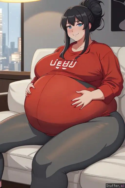 uhd 8k, highly detailed,sharp focus, anime style, digital art,masterpiece,1 anime girl,(Enormously obese immobile fat girl with a gigantic soft belly),( extremely enormous oversized pregnant belly:1.8),(plus size red Tshirt:1.2),(Dark_grey_yoga_pants), plump woman ,(black hair age 25),blue eyes,((updo hair messy)),slight smirk,sitting back on couch relaxed,night scene,hands grabbing own belly