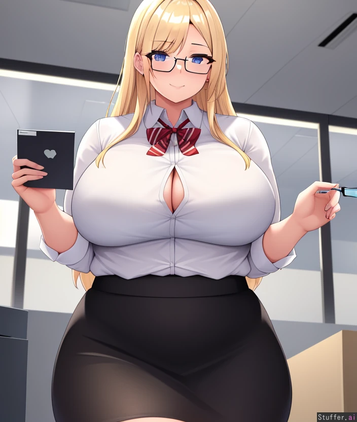 1girl, office, blonde_hair ,glasses, skirt, white_shirt , fat rolls , large_breasts