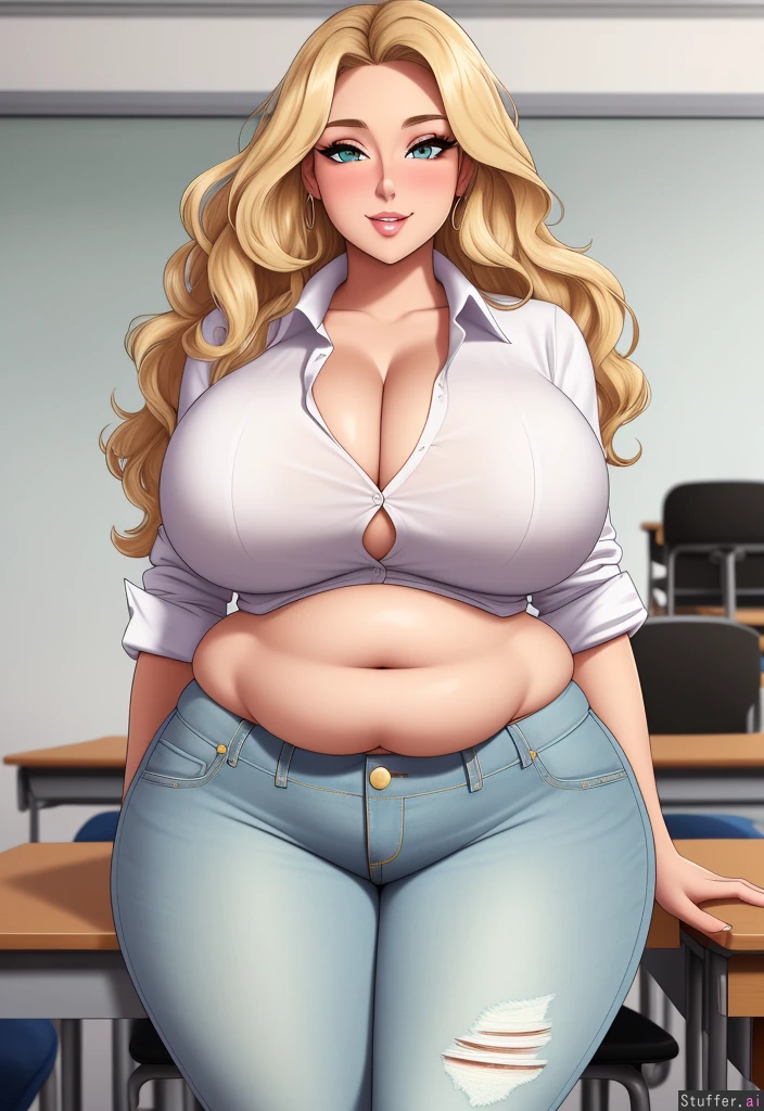Tall blonde Bbw teacher named Jessica. 6 foot 3 and 256 pounds. Huge luscious boobs, (chubby belly) and thick thighs. In a classroom. She has messy wavy blonde hair. ((She is wearing a white button shirt that is way too small for her boobs and belly)) (Tight low rise jeans) Wearing tight She is leaning over the desk above the viewer. She is way bigger than the viewer. She eyes the viewer lustfully and below her. Both hands on the desk.