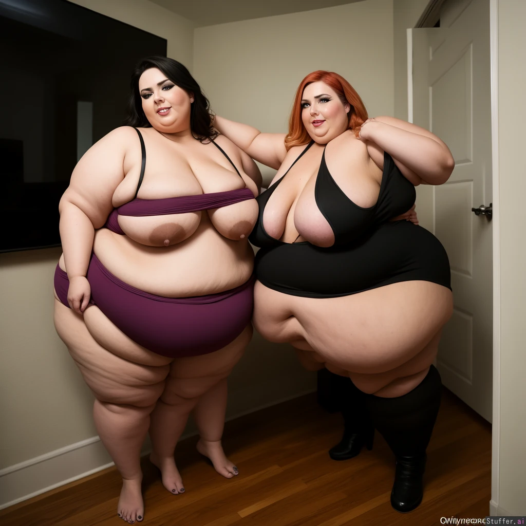 Only one person in photo, Photo realistic, obese ssbbw, highly detailed, big tits, cleavage, under boob, tight black crop top, tight shorts , large fat hanging belly, realistic lighting, standing