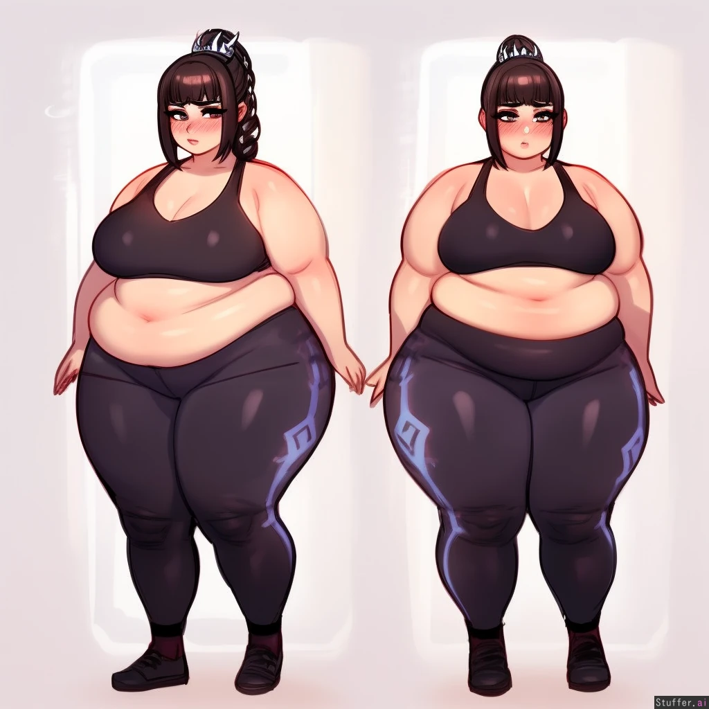 best quality, high rating, perfect anatomy, c.cu(artist), blushyspicy(artist), spellsx(artist), kafekafei(artist), (((5ft 10in))), (((300 pounds in first frame to 800 pounds in second frame))), (Shadowheart (baldur's gate 3)), full body view, brown hair, 1girl, standing in the living room, detailed face, fearful face, chubby face, white slightly tan skin, chubby belly, ssbbw, (medium breasts), brown eyes, (big flabby belly), (plump fat ass), wide hips (very wide), (massive hips and ass), black sports bra, tight black leggings, deep cleavage, thick thighs, worried about her belly, jiggling her belly, hands on sides of belly, cute, bottom-heavy_ssbbw, wide_hips, fat rolls, fat_folds, sagging_belly, ponytail, obese, belly_folds, pearshaped body, muffin_top, love_handles, fat legs, massive thighs, massive fat calves, cellulite, extreme weight_gain, ripped_pants, embarrassed, body inflating (like a gigantic overstuffed blimp), (extreme body expanding with fat (like a waterballoon overfilled)), ((blueberry expansion (like a waterballoon))), belly, hips, ass and upper body expanding and pillowing out (like an overstuffed marshmallow), ((two part weight gain sequence)) (((two frames of same character))) (((same angle and pose for each frame))) ((showing weight difference of character ((first frame lower weight (left side), second frame higher weight (right side)))))
