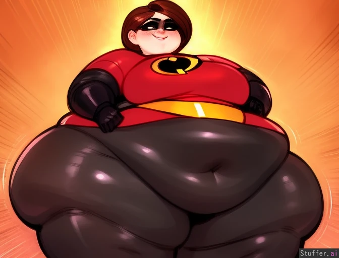 best quality, high rating, masterpiece, hyper detailed, hyper detailed face, 1girl, solo, definition lines, Elasti-girl (The Incredibles), c.cu(artist), blushyspicy(artist), textless, brown eyes, auburn_hair, red_streak, Red Elasti-girl spandex suit, standing , bright_background, wide_hips, smiling, closed_mouth, morbidly obese,huge ass , flabby thighs, large_breasts , flab, fat rolls , fat_folds , arms_behind_head , bbw