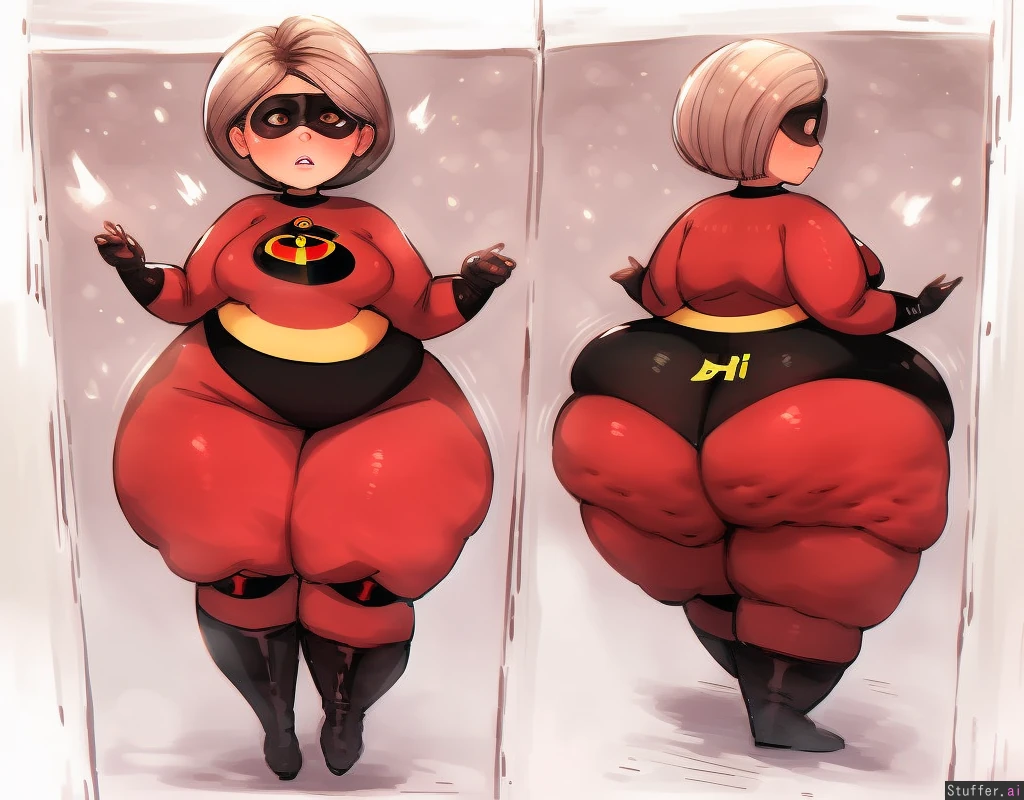best quality, high rating, stunning beauty, (high rating), ((Elasti-girl ((The Incredibles)))), masterpiece, high quality, 8k, ((5ft 8in)), (((200 pounds ((accurate weight))))), high resolution, intricate detail, beautiful face, detailed eyes, realistic face, brown eyes, bob-cut hair, concerned facial expression, staring down, no eye mask, auburn hair, standing, sudden growth, ((red spandex suit covering full body)) Cellulite:0.01, fat belly, realistic skin, ((light tan skin:2.5)), huge_thighs, thick_legs, giant_ass, front view, full body view, (artist), SuperSnackSized(artist), spellsX(artist), c.cu(artist),