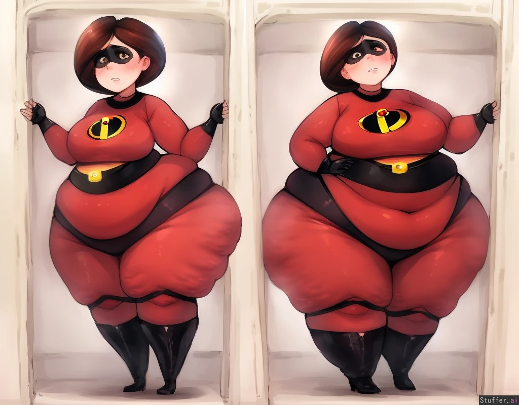 best quality, high rating, stunning beauty, (high rating), ((Elasti-girl ((The Incredibles)))), masterpiece, high quality, 8k, ((5ft 8in)), (((200 pounds ((accurate weight))))), high resolution, intricate detail, beautiful face, detailed eyes, realistic face, brown eyes, bob-cut hair, concerned facial expression, staring down, no eye mask, nothing on face, auburn hair, standing, sudden growth, pear-shaped body, ((red spandex suit covering full body)) Cellulite:0.01, fat belly, realistic skin, ((light tan skin:2.5)), huge_thighs, thick_legs, giant_ass, front view, full body view, (artist), SuperSnackSized(artist), spellsX(artist), c.cu(artist), same face, same outfit, body expanding (like a fat balloon), 2 part sequence