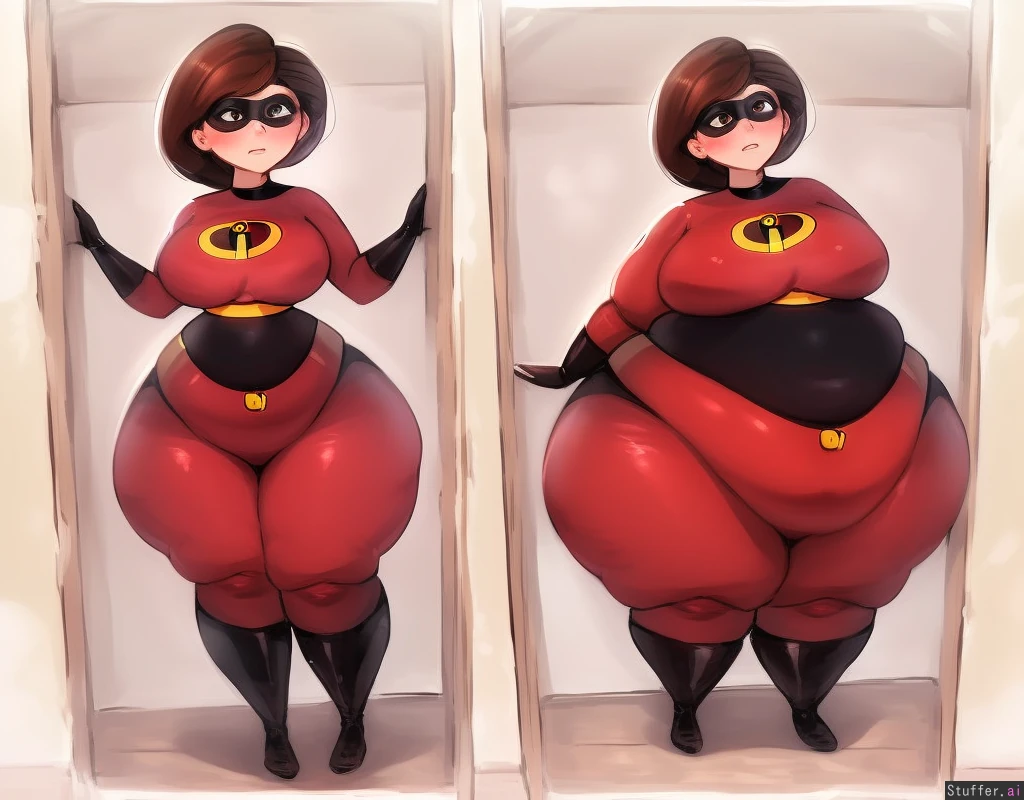 best quality, high rating, stunning beauty, (high rating), ((Elasti-girl ((The Incredibles)))), masterpiece, high quality, 8k, ((5ft 8in)), (((200 pounds ((accurate weight))))), high resolution, intricate detail, beautiful face, detailed eyes, realistic face, brown eyes, clear face, worried face, blushing, bob-cut hair, concerned facial expression, staring down, auburn hair, standing, sudden growth, pear-shaped body, ((red spandex suit covering full body)) Cellulite:0.01, fat belly, realistic skin, ((light tan skin:2.5)), huge_thighs, thick_legs, giant_ass, front view, full body view, (artist), SuperSnackSized(artist), spellsX(artist), c.cu(artist), same face, same outfit, same pose, body expanding (like a balloon), 2 part sequence, ((200 pounds in part one, 400 pounds in part two))
