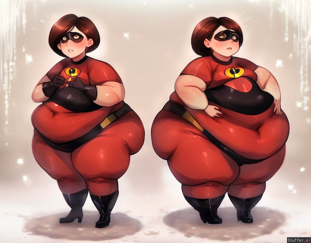 best quality, high rating, stunning beauty, (high rating), ((Elasti-girl ((The Incredibles)))), masterpiece, high quality, 8k, ((5ft 8in)), ((180 pounds ((accurate weight)))), wide eyes, high resolution, intricate detail, beautiful face, detailed eyes, realistic face, brown eyes, clear face, worried face, blushing, bob-cut hair, concerned facial expression, staring down, looking at belly, auburn hair, standing, sudden growth, (pear-shaped body), ((red spandex suit covering full body)) Cellulite:0.01, fat belly, plush arms, realistic skin, ((light tan skin:2.5)), huge_thighs, thick_legs, giant_ass, front view, full body view, SuperSnackSized(artist), (((spellsX(artist))), ((c.cu(artist))), ((hands on sides of belly, hands in same place and position in first part)), ((both arms extended outward from being too fat in second part)), same face, same outfit, ((same stance)), ((full body expanding (like a blimp over-filling with fat))), ((((two part sequence)))), ((180 pounds in part one, 600 pounds in part two)), rapid weight gain