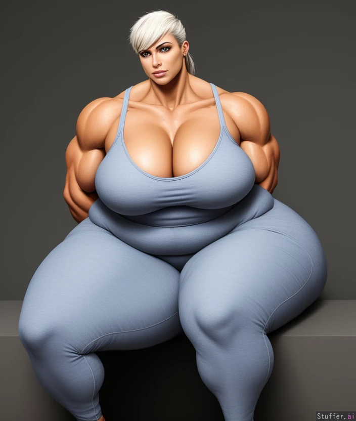 A girl with a very muscular body, huge muscles, huge biceps, biceps larger than head, very tall, 6'5" , very thick thighs, muscular thighs, small head, small waist, big and wide shoulders, huge muscle traps, white hair, swept bangs, side ponytail, white dress, muscular arms, huge arms, veins, huge breast, 1girl, swole arms, muscular female, lifting weights, bodysuit, top heavy, muscular shoulders, big girl.