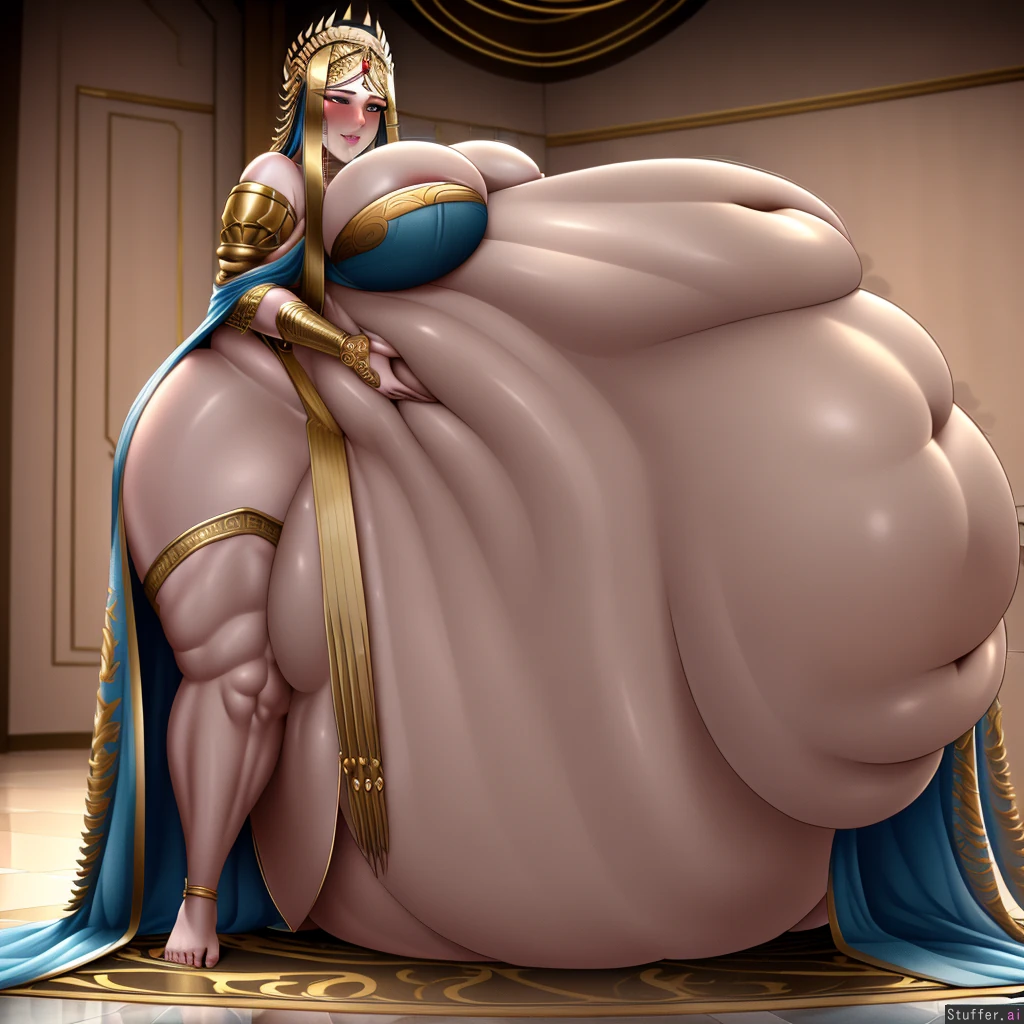 intricate detail,zenobia, best settings, perfect anatomy, detailed skin,intricate face,pretty face, fat belly, round belly,fat arms,((one deep navel)),(grabing belly),burping,burping motion lines around belly,big breasts,((belly touching floor)),resting on belly