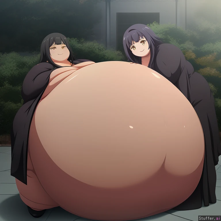 best quality, high rating, miramiraclerun, black robe, black hair, peach skin, yellow eyes, obese, black slipper, smile, gigantic belly, round belly