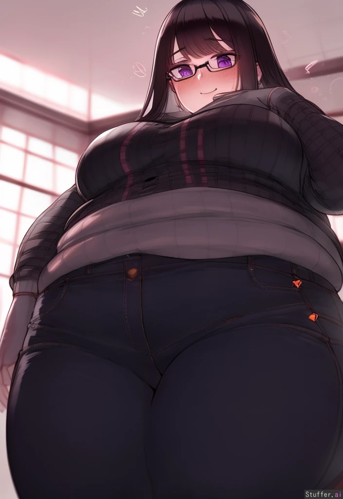 best quality, high rating,, betterwithsalt (artist), c.cu(artist, spellsx(artist), wavy hair, wild hair, large purple eyes, glasses, freckles, oversized hoodie, hoodie that amplifies her curves, tight jeans, thighs stretching jeans, jeans barely fit her, jeans make her thighs and legs look enormous, plump belly, soft arms, thick huge lovehandles, huge boobs, thick thighs, ((chubby)), (weight gain), (embarrassed), blushing, shy and awkward grin, before and after, (huge weight gain) (Arrow pointing to after) visibly larger Belly and hips, visibly wider abdomen, ((visibly much larger thighs))((very wide thighs)) (Very overweight) (very thick thighs) Large wide eyes, unique hair, (thighs so large they could crush you:2.5) (huge amounts of weight gained) excessive weight gain, fat rolls, (massive lower body) Girl is very chunky, closeup, clothes bursting, (unique body shape that makes her extra curvy) very unique curves, curves in unexpected places, (weight gain is over 100 lbs) most of her weight is in her thighs and hips, larger on right side of picture, eye contact, blushing, unique curve locations, unique fat rolls, visibly huge amount of weight gain, extremely wide, ((enormous stomach)) visibly larger on after, visibly smaller on before, straddling viewer, view from below, sitting on viewer, thighs wrapped around viewer,