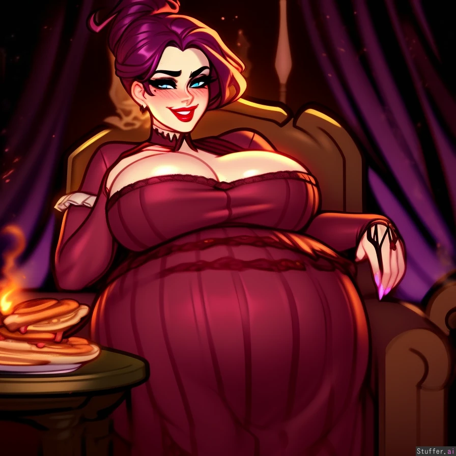 best quality, high rating, victorian, 1woman, mature, billionaire heiress, bossy corrupt demanding gluttonous greedy spoiled, sly smile, getaway, bbw feedee, belly stuffing, insatiable hunger, ravenous overeating, massive weight gain, blushyspicy(artist) spells(artist)