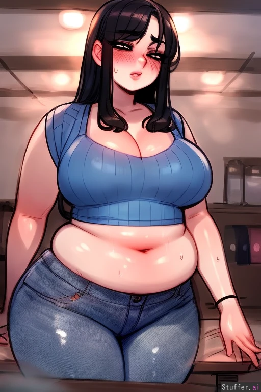 best quality, high rating, c.cu(artist), blushyspicy(artist), betterwithsalt(artis), aroma sensei(artist), very detailed face, 1girl, straight black hair, chubby, large soft belly, midriff, blue tanktop, jeans, weight gain, outgrown clothes, skindentation, open_fly