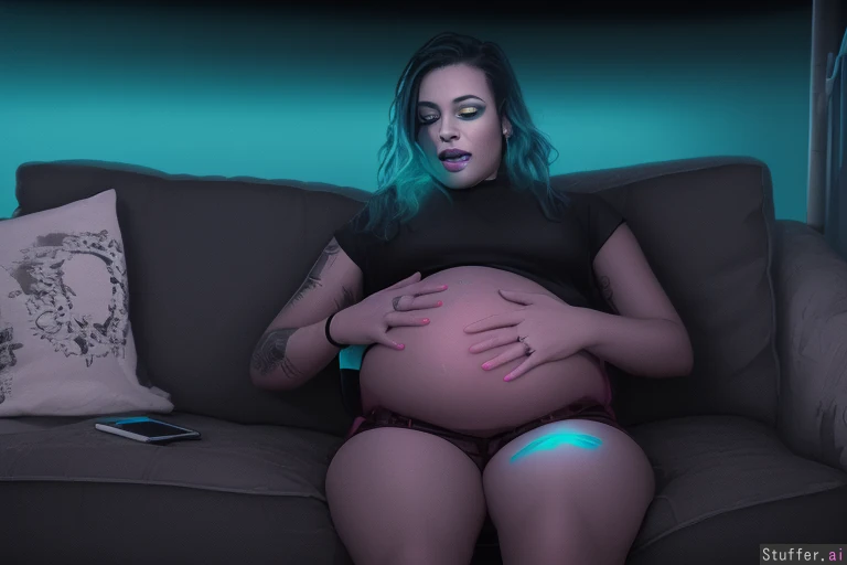 woman, small_breasts, fully dressed, eyeliner, cyberpunk , night city, messy_hair, updo, long_legs, deep navel, windbreaker, pregnant, hands_on_belly, (fully_clothed:1.5)