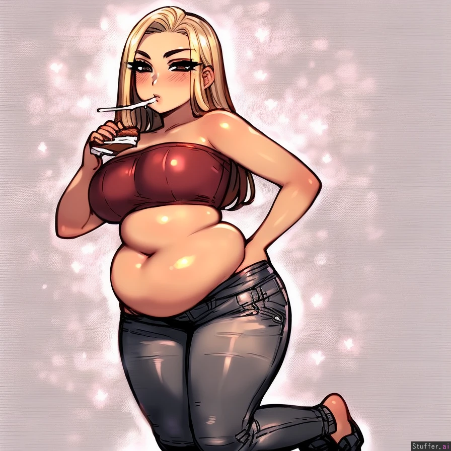 best quality, high rating, c.cu (artist), blushyspicy (artist), full body, long blonde hair, dark brown eyes, detailed eyes, tanned skin, long eyelashes, turned on, sexy face, 1woman, tube-top is tight, exposed round stomach, tight black low-rise jeans, obese woman, (bulging fat belly), hourglass body, ((muffin_top_belly)), (love_handles), ((heavy belly hangs out of pants:1.9)), ((pants do not fit:1.5)), skinny upper torso, long torso, ((fat waist:1.5)), eating cake, stuffing her face, visible white underwear, standing up