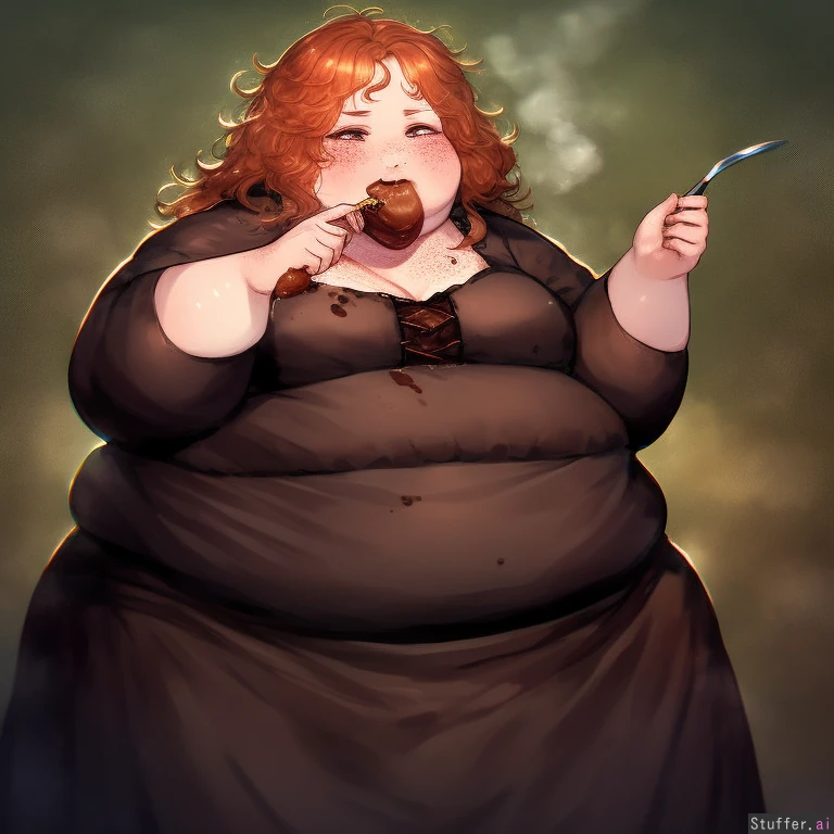 best quality, high rating, detailed realistic++ masterpiece, 8k, c.cu-, blushspicy-, 1girl, medieval, (short young dirty poor beggar fat young obese girl), (fat- young face), (flat small+ flat small flat covered chest):1.1, (poor ragged medival beggar dress), (messy wild unwashed hair), (brown unwashed ginger hair), (freckled skin), (hungry crazy ravenous expression), desserts, (morbidly obese):1.15, (soft fat), (fat-legs-), wide hips, (messy gluttony eating), (putting food in mouth)