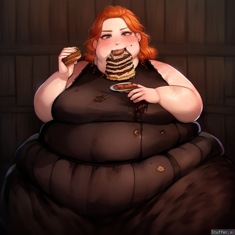 best quality, high rating, (detailed realistic++ masterpiece), 8k, c.cu-, blushspicy-, 1girl, medieval, (short young dirty poor beggar fat obese girl), (fat-- young face), (flat small+ flat small flat covered chest):1.1, (dirty poor old damaged ragged coarse medival beggar dress), (messy wild unwashed hair), (brown unwashed ginger hair), (freckled skin), (crazy ravenous expression), desserts, (morbidly obese):1.15, (soft fat)--, (fat-legs-), wide hips, (messy gluttony eating), (putting food in mouth)