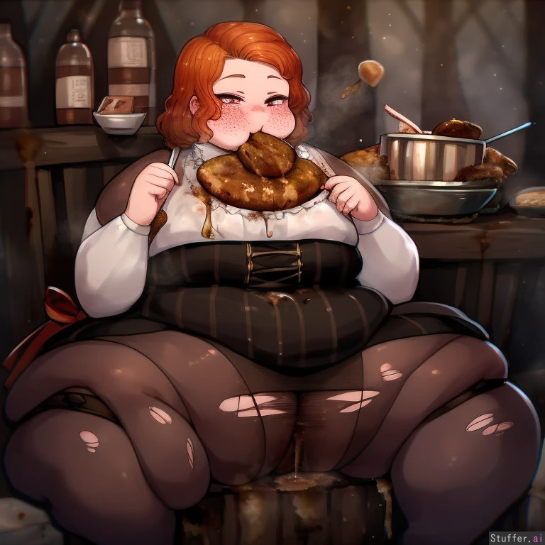 best quality, high rating, (detailed realistic++ masterpiece), 8k, c.cu-, blushspicy-, 1girl, medieval, (short young dirty poor beggar fat obese girl), (young face), (flat small+ flat small flat covered chest):1.1, (dirty poor old torn ragged coarse medival beggar dress), (messy wild unwashed dirty messy hair), (brown dirty unwashed ginger hair), (freckled skin), (desperate pleasure hungry expression), desserts, (morbidly obese):1.15, (fat-legs-), wide hips, (messy gluttony eating), (putting food in mouth), blushing,