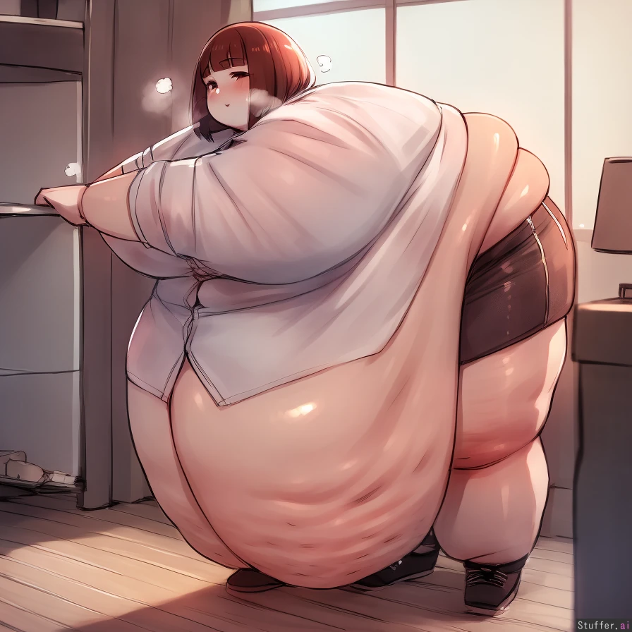 best quality, high rating, best quality, ((high rating:1.25)), (spellsx\(artist\)), (betterwithsalt\(artist\)), (c.cu\(artist\)), (perfect face), (detailed face), apartment, sunny, (short brown hair, bob cut, straight bangs), ussbbw , morbidly obese, huge belly, huge belly sag, belly hanging on above the floor , overstuffed, very fat arms, plump legs, cellulite, heavy breathing, large breast, standing, straight, fat folds, shorts, white button down shirt, button gap