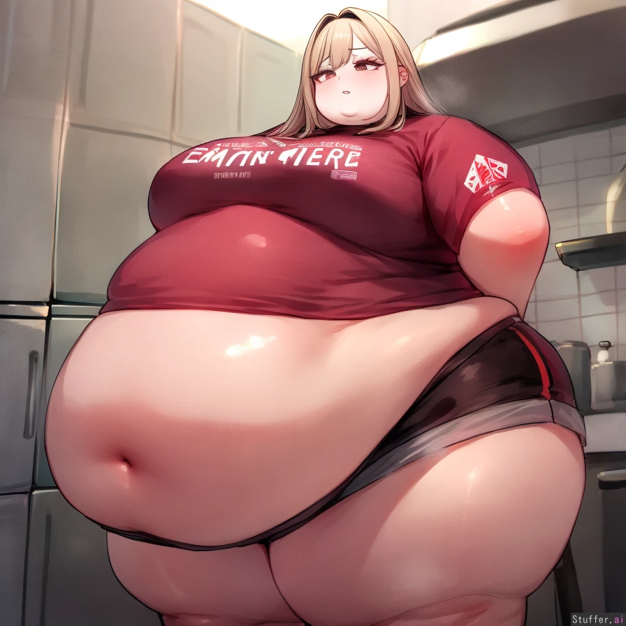 best quality, high rating, one woman, c.cu, betterwithsalt, spellsx, 1girl, detailed face, long eyelashes, chubby, long light blonde hair, brown eyes, huge belly, belly bloated and enlarged, huge thighs, huge hips, big ass, big fat upper arms, medium breasts, 20 year old woman, tshirt, shorts, chubby face, double chin, kitchen, (Emma(Nikke))