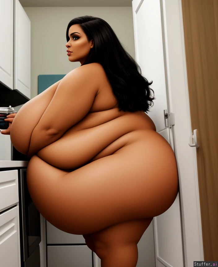 Latina, cute, plump, sexy, curvy, voluptuous, wide hips, ((((massive round low belly)))), standing in kitchen, pregnancy , ((side view)), massive ass, nude , fat legs, perfect anatomy , (((gigantic breasts, )))soft layer of thick fat all over