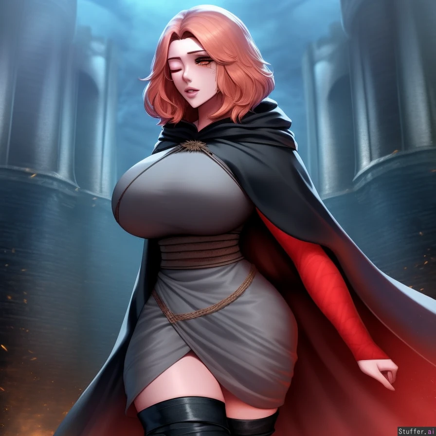 best quality, high rating, Melina, Elden Ring, 1girl, solo, detailed face, gorgeous, scar across eye, one eye closed, yellow eyes, strawberry-blonde hair, medium hair, black cloak, hooded cloak, hood down, grey dress, long sleeves, cape, thigh boots, detailed background, nighttime, large breasts, standing, soft lips